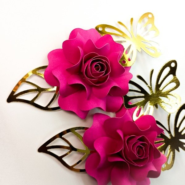 2 rosas de 7 cm aprox. Con hoja espejada mide 10 cm aprox. en total, (las hojas pueden ir doradas o plateadas)